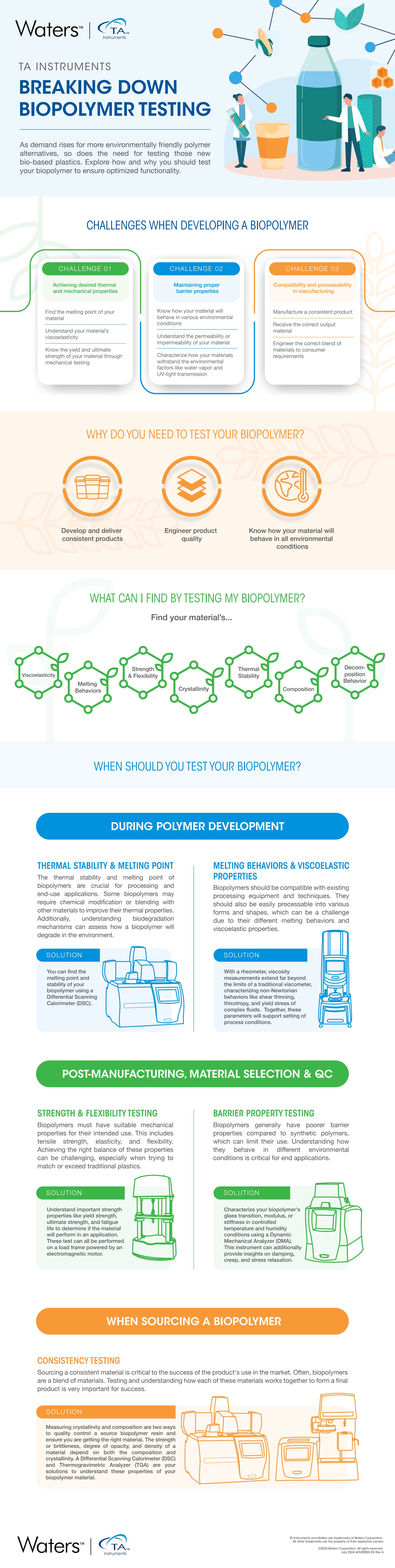 An educational infographic that translates the complexities of biopolymer testing into a clear, step-by-step visual narrative, connecting material challenges to the right analytical techniques across development, manufacturing, and quality control.