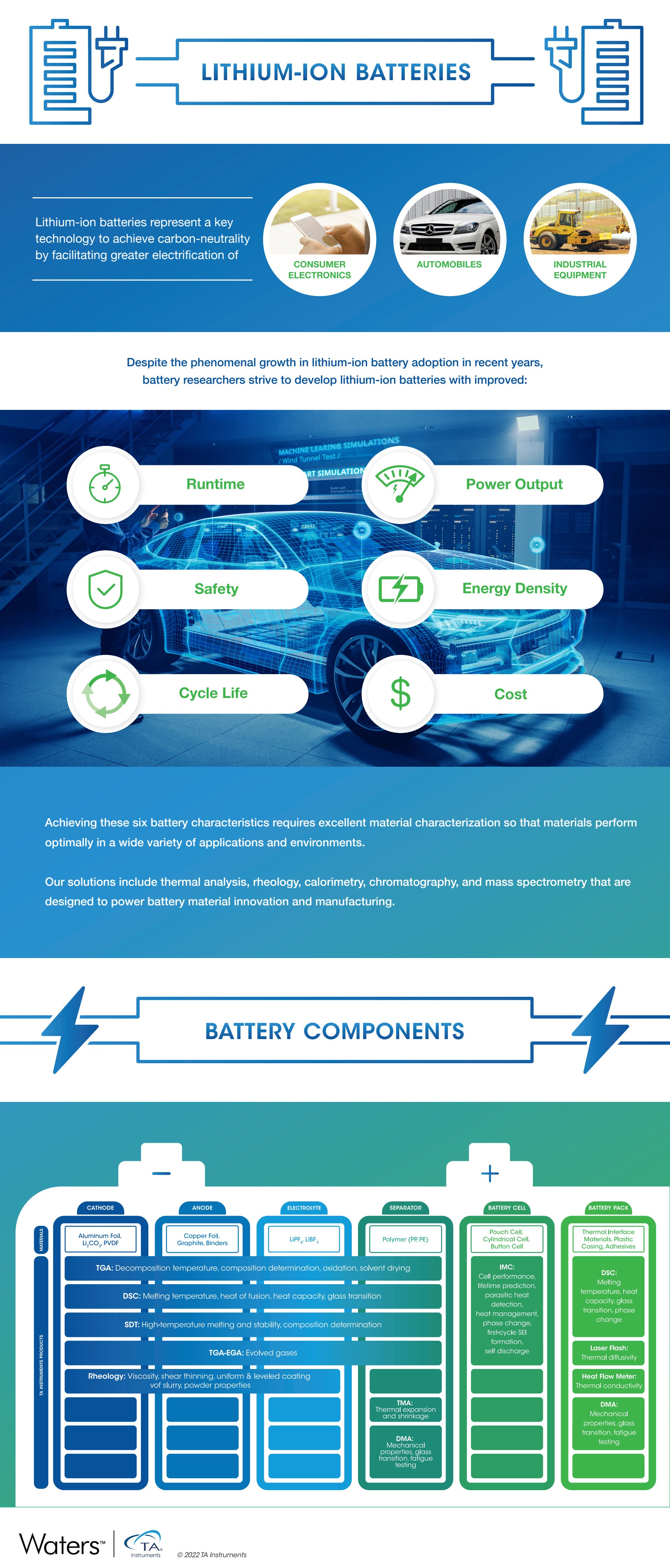 A visually structured infographic that simplifies the relationship between battery performance goals and the material characterization techniques that make them possible.