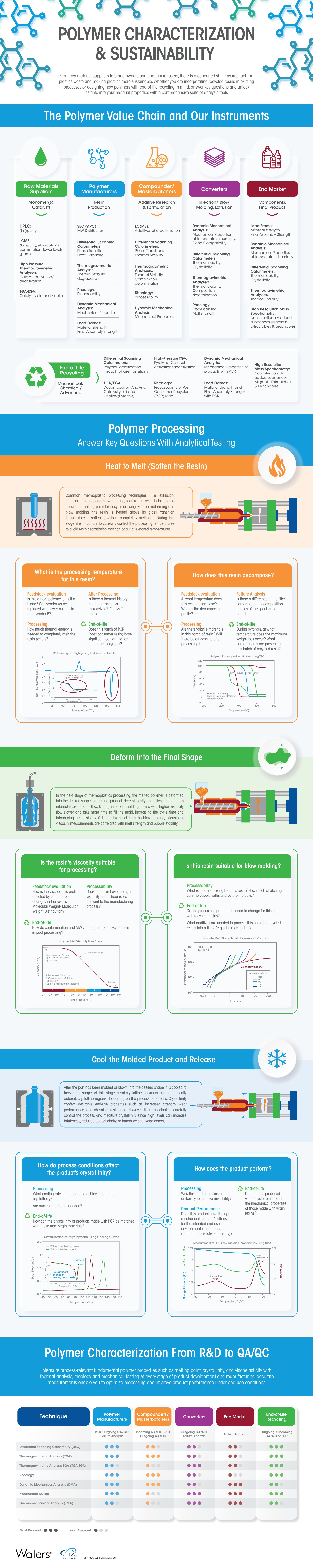 A visual overview of how polymers are processed, tested, and recycled, this infographic showcases key measurements, such as melting behavior, viscosity, and crystallinity, that drive quality and sustainability across the value chain.